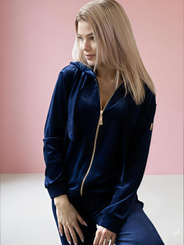 Komplet wykonany z aksamitnego weluru w kolorze granatowym. Bluza z podwójnym kapturem, zapięta na złoty suwak z ozdobnymi wiązaniami. Spodnie na szerokim ściagaczu. W pasie znajduje się elastyczna gumka oraz wkładane kieszenie po bokach w przedniej części spodni. Rękaw i spodnie logowane złotą skórką