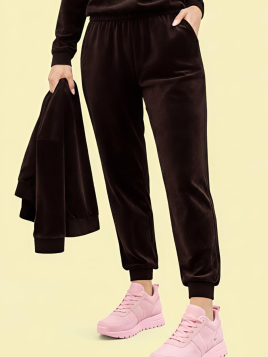 Spodnie w kolorze czekoladowym, wykonane z aksamitnego weluru Soft, dół nogawek ze ściągaczem, boczne wsuwane kieszenie, w pasie elastyczna guma