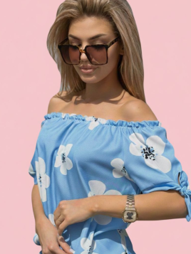 Błękitna bluzka w kwiatowy print. Rękawy 3/4 z wiązaniami. Dekolt z komfortową gumką dzięki niej można nosić na dwa sposoby - odkrytych ramion jak, i z zasłoniętych.