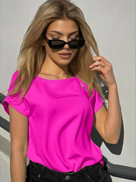Klasyczna bluzka z ozdobną broszką w kształcie ważki. Tył bluzki z oryginalnym, okrągłym wycięciem, rękawy zakończone delikatnym mankietem.